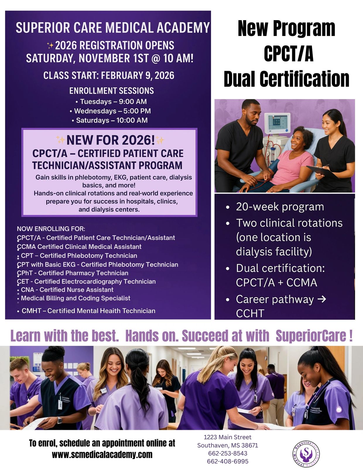 SuperiorCare Medical Academy proudly presents our newest program — the Certified Patient Care Technician/Assistant (CPCT/A) — designed to give students a strong foundation in patient care with an introduction to the field of dialysis.